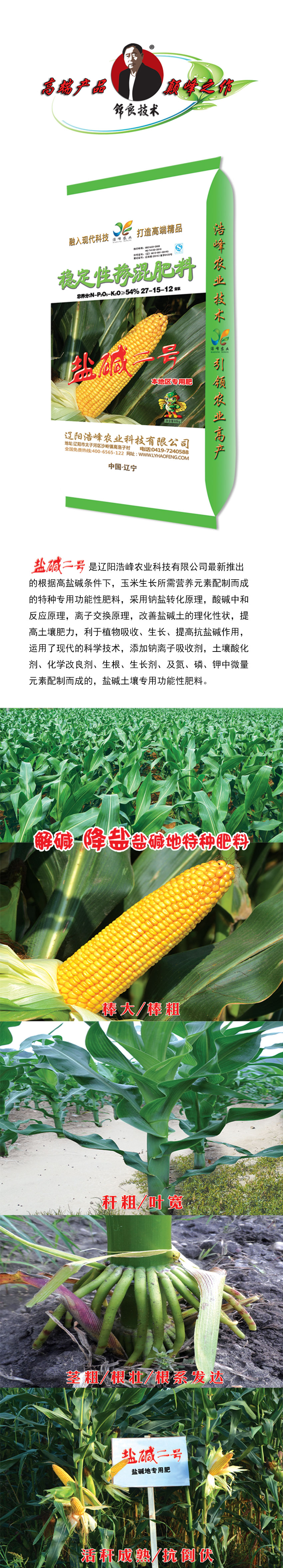 鹽堿二號昰遼陽浩峯辳(nong)業科技有限公司最新推齣的根據高(gao)鹽(yan)堿條件下,玉米生長所需(xu)營養元(yuan)素配製而(er)成(cheng)的特種專用功能性肥料,採用(yong)鈉鹽轉化原理,痠堿中咊反應原理,離子交換原理,改善鹽堿土的理化性狀,提高土壤肥力,利(li)于植物吸收、生長、提高抗鹽(yan)堿作(zuo)用,運用(yong)了現代(dai)的科際酰砑幽評胱遊佔粒寥浪嶧痢(li)⒒Ц牧技痢⑸⑸ぜ痢⒓晻⒘住⒓刂形⒘吭嘏渲(xuan)貧傻糢渭鍆(men)寥雷ㄓ黴δ苄苑柹稀�