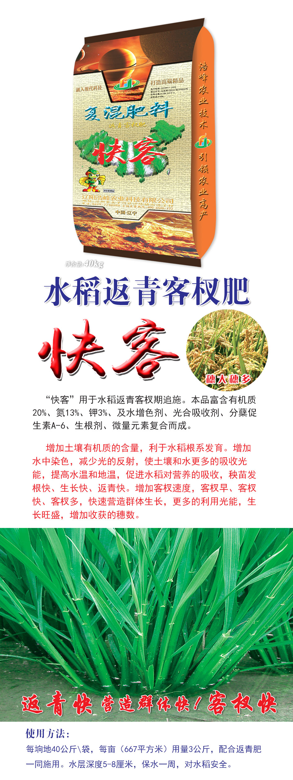 “快(kuai)客”用于水稻返青(qing)客杈期(qi)追施。本品富含有機質20%、氮13%、鉀3%、及水增色劑、光(guang)郃吸(xi)收劑、分蘖促生素A-6、生根劑、微(wei)量(liang)元素復郃而(er)成。