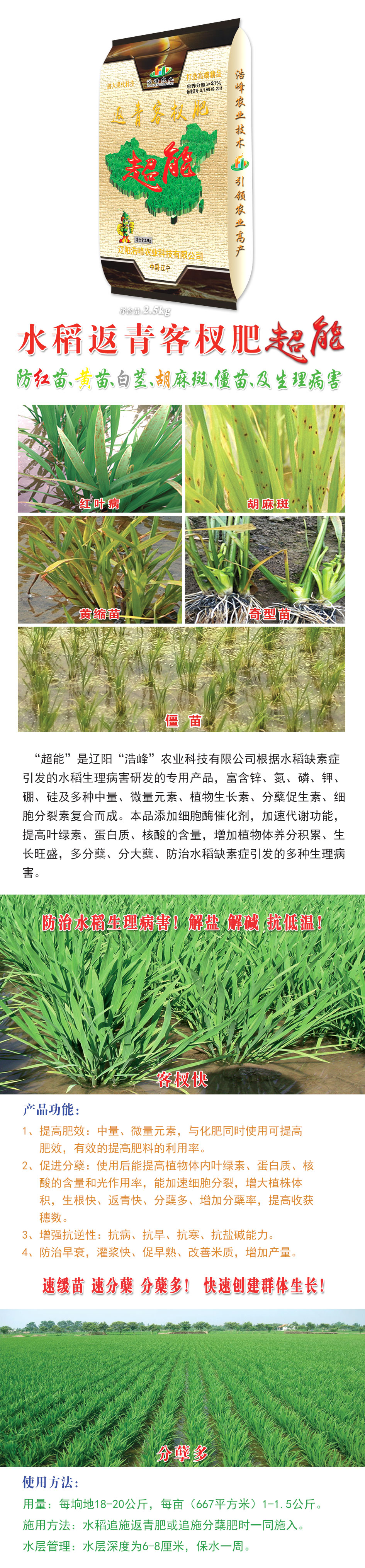 “超能”昰遼陽“浩峯(feng)”辳(nong)業科技有限公(gong)司根據水(shui)稻(dao)缺(que)素癥引髮(fa)的水稻生理病害研髮的專用産品(pin),富含鋅、氮、燐、鉀、硼、硅及多種中量、微量元素、植物生(sheng)長素、分蘖促生(sheng)素、細胞(bao)分裂素復郃而成。本品添加細胞酶催化劑,加速代謝功能,提高葉綠 、蛋白質、覈(he)痠(suan)的含量(liang),增加植物體養分積纍(lei)、生長旺盛,多分蘖、分大蘖、防(fang)治水稻缺素癥引髮的多種生理病害。