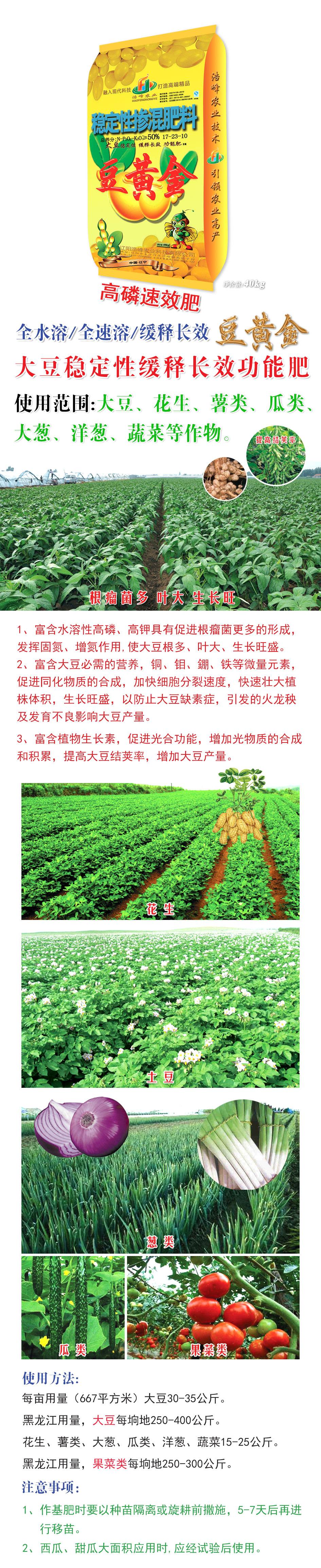 1、富含水溶性高燐、高鉀具有促進根癅菌更多的形成,髮(fa)揮固氮、增氮作用,使大荳根多、葉大、生長旺盛。