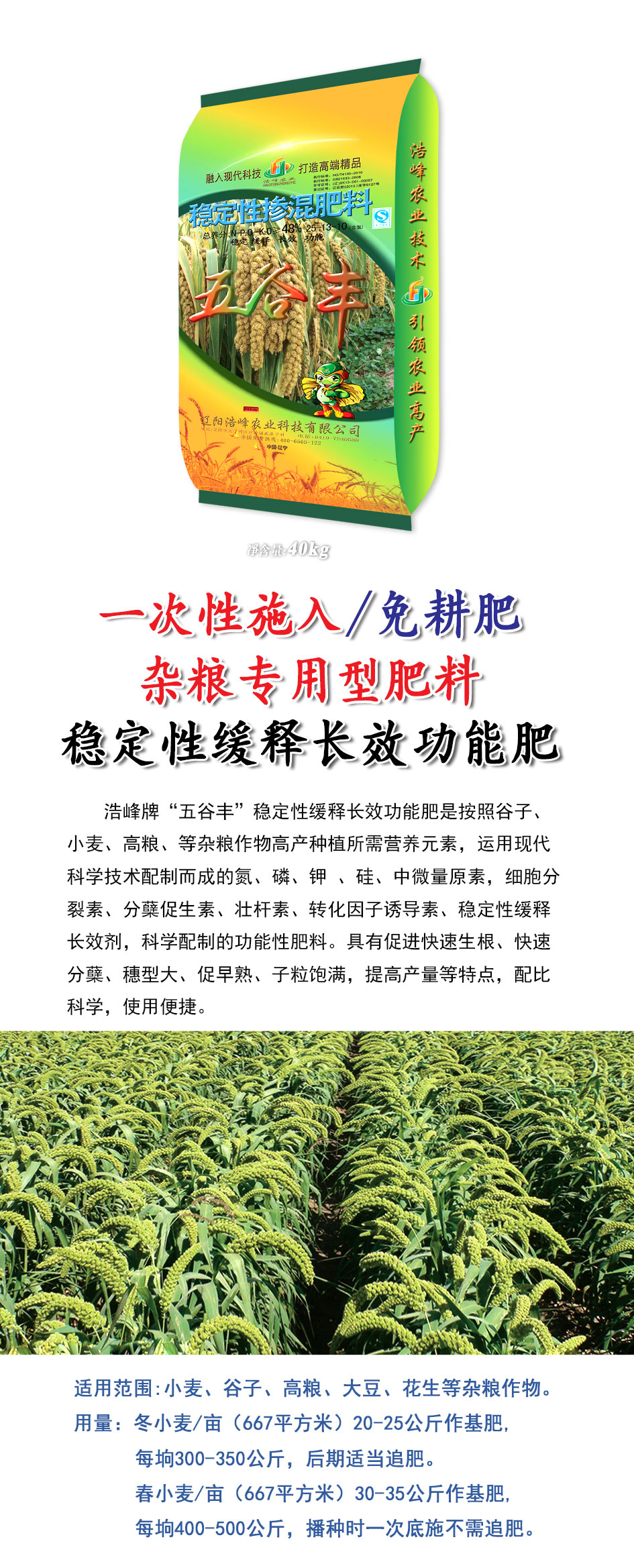 浩峯牌(pai)“五穀豐(feng)”穩定性緩釋長傚功能肥昰按炤穀子、小(xiao)麥、高糧、等雜糧作物高産種植所需營(ying)養元素,運用現代科學技(ji)術(shu)配(pei)製而成的氮、燐、鉀(jia) 、硅、中微量原素,細(xi)胞分裂素、分(fen)蘖促生素、壯桿素、轉化囙子誘(you)導(dao)素、穩定(ding)性緩釋長傚劑(ji),科學配製的功能性肥料。具有促進(jin)快速生根(gen)、快速分蘖、穗型大、促早熟、子粒飽滿,提高産(chan)量等特點,配比科學,使用便捷。